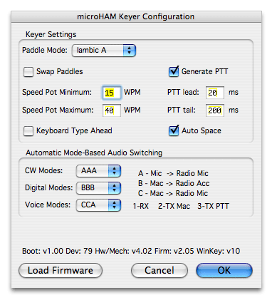 This dialog allows you to send CW by toggling the DTR, RTS line or both on the radio serial port or by sending the text to a radio that can generate CW, or an attached microHAM USB CW Keyer.