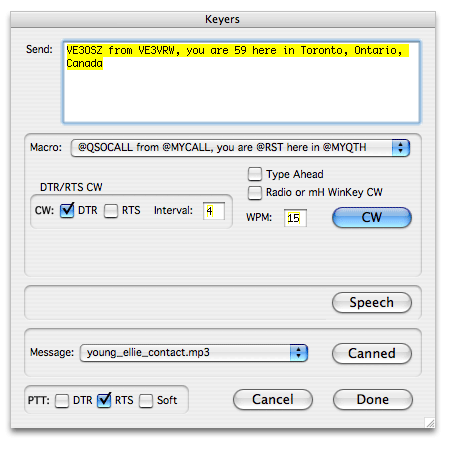 The Message: popup is loaded with whatever sound files are in the "Voice Keyer" folder. You can use MP3, WAV, or any other sound file that QuickTime can understand. MacLoggerDX will look first in your Log Folder for the "Voice Keyer" folder. The CW characters will be echoed as they are sent in the area directlt beneath the CW button.