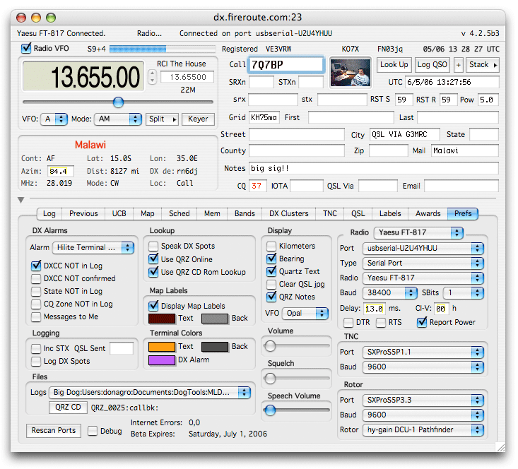 - The QRZ Notes checkbox determines whether or not extra information like birth date, licence date, url etc. are added to the Notes field during a call lookup.