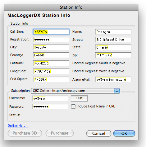 The Station Info dialog allows you to enter your Call Sign, Registration Number, Latitude and Longitude and/or Grid Square. If you enter your grid square, MacLoggerDX will calculate your approximate Latitude and Longitude. If you enter your Latitude and Longitude, MacLoggerDX will calculate your Maidenhead Grid Square. For information on the Maidenhead Grid Square Locator System click on this link... <http://www.arrl.org/locate/gridinfo.html> Control-clicking on the URL at the bottom of the window activates a contextual menu which allows you to copy the URL into the Clipboard, or jump to that URL.