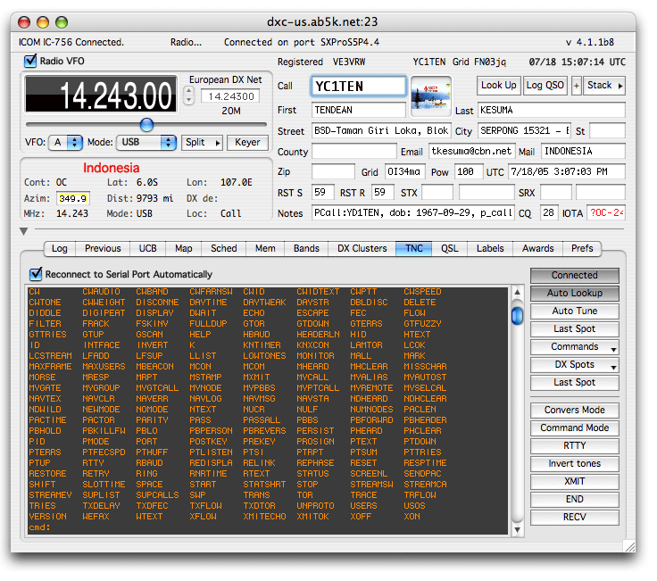 The terminal client in this panel can connect to any RS-232C serial device but when connected to a Terminal Node Controller (TNC) will allow you to connect to any Packet DXCluster node and optionally automatically lookup and tune to the spots being reported on the cluster.