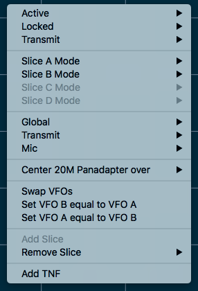 Control or right-clicking on the Panadapter display brings up a contextual menu which provides quick access to VFO/Slice commands.