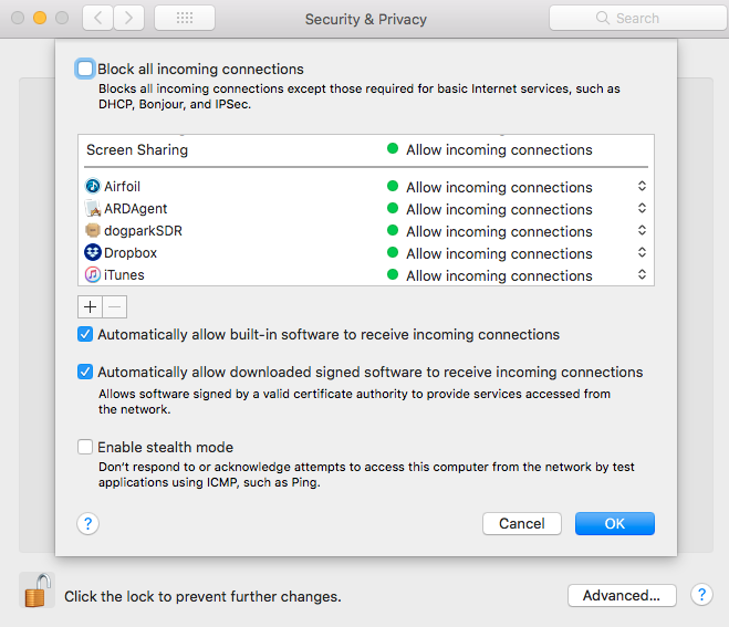 If your Mac Firewall is enabled in System Preferences / Security & Privacy / Firewall, make sure you set it to allow dogparkSDR or any signed application.