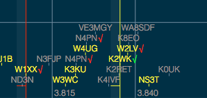 A check mark beside the call indicates that you have worked this station before and it is in your log. A green check mark indicates you have worked this station on this band, red a different band.