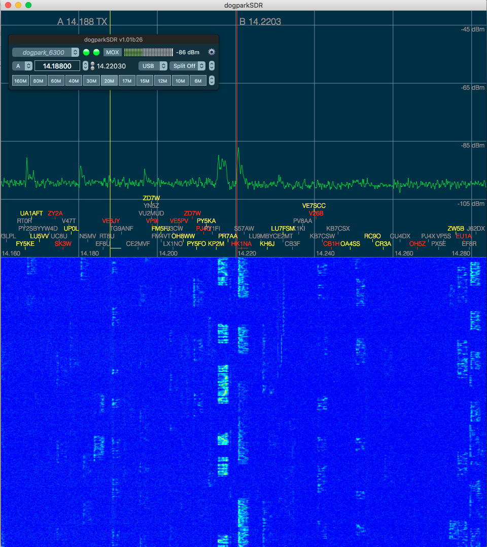 dogparkSDR can also display spots uploaded to the radio server, the SmartSDR Radio Spots check box must be enabled in the MacLoggerDX DXClusters prefs and the Radio Spots check box must be enabled in the Radio Prefs.